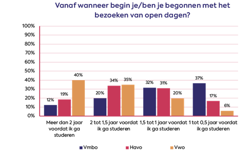 - 75% van de vwo’ers geeft aan meer dan 1,5 jaar van tevoren te beginnen met het bezoeken van open dagen. Dit is significant vaker dan havisten en vmbo’ers (p < .001).