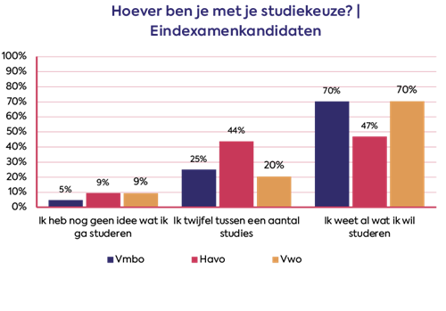 Hoever zijn scholieren met hun studiekeuze? Rond de kerstvakantie peilen we altijd bij vmbo’ers, havisten en vwo’ers hoever ze zijn in hun oriëntatieproces. Weten ze al wat het gaat worden of zijn ze nog zoekende? En in hoeverre zien we verschuivingen als we vergelijken met de jaren hiervoor?