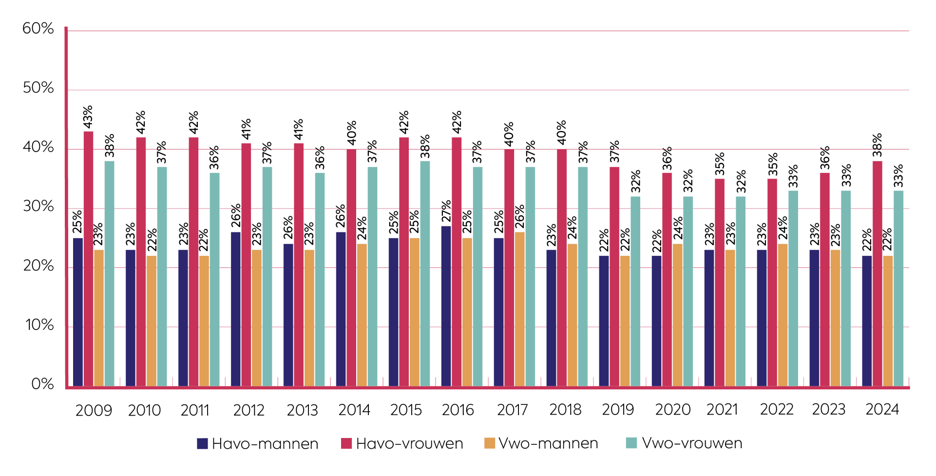 Door de jaren heen is de interesse van vrouwen in lesgeven sterker gedaald dan die van mannen. Bij vrouwelijke havisten daalde het percentage scholieren dat aangaf lesgeven leuk te vinden met 5 procentpunt van 43% in 2009 naar 38% in 2024. Bij vrouwelijke vwo’ers daalde dit ook met 5 procentpunt van 38% in 2009 naar 33% in 2024. Bij de mannen schommelen deze percentages iets meer: onder mannelijke havisten daalde het percentage scholieren met interesse in lesgeven met 3 procentpunt van 25% in 2009 naar 22% in 2024. In 2016 was er juist sprake van een stijging: in dat jaar gaf 27% van de mannelijke havisten aan dat lesgeven hen leuk lijkt. Dit patroon is ook onder vwo-mannen te zien: in 2009 gaf 23% aan dat lesgeven hen leuk lijkt. Dit stijgt in 2017 met 3 procentpunt naar 26%, om vervolgens te dalen met 4 procentpunt naar 22% in 2024.